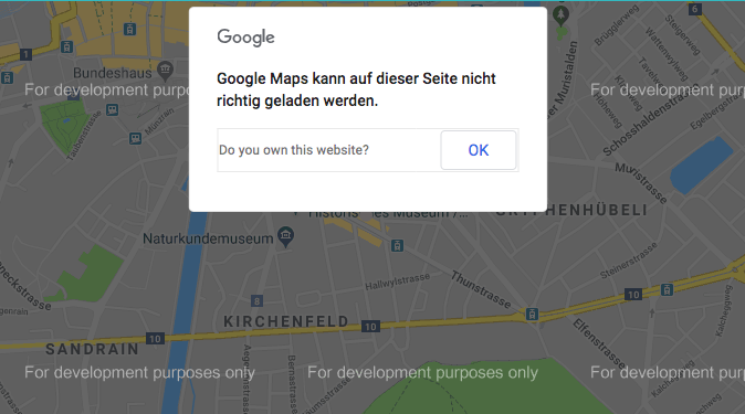 Ist dies nicht der Fall, wird die Karte in schlechter Qualität und mit einem Wasserzeichen „nur für Entwicklungszwecke“ dargestellt. Zudem wird von Google ein Hinweis aufgeschaltet.